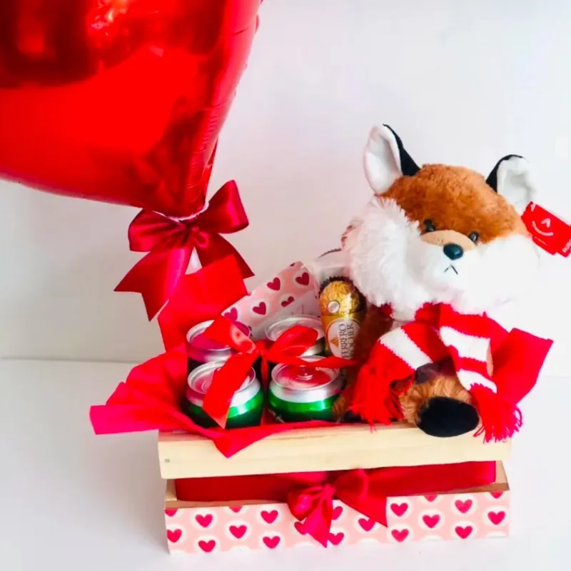• Caja de madera decorada con globo grande • Peluche 20cm (consultar disponibles) • 4 cervezas • 3 bombones FERRERO ROCHER • 10 bombones LEXUS • 1 vela decorativa • 1 postal