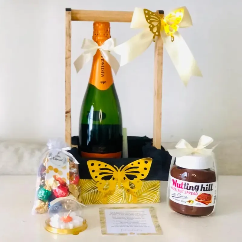 • Cesta de madera decorada con lazo: • Vino espumoso • Nutella • 10 bombones • velita • postal