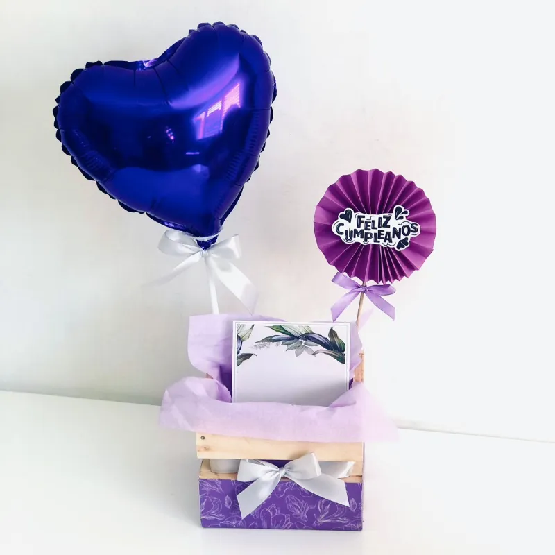 • Cajita de madera decorada con decoupage y lazo, globo metalizado 10", rosetón y postal.