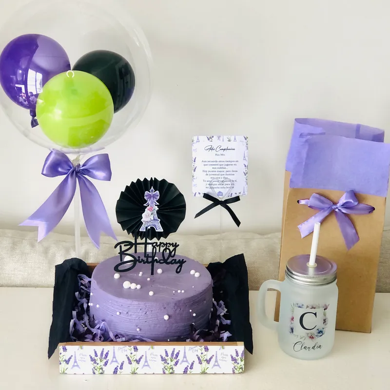 Bandejita decorada con globo burbuja • delicioso pastel relleno de mousse de chocolate • jarra personalizada con empaque