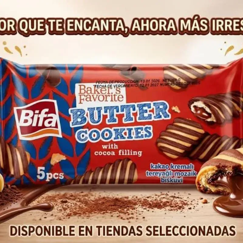Bifa Butter Cookies con relleno de cacao, el sabor que te encanta en su presentación de 5 unidades.