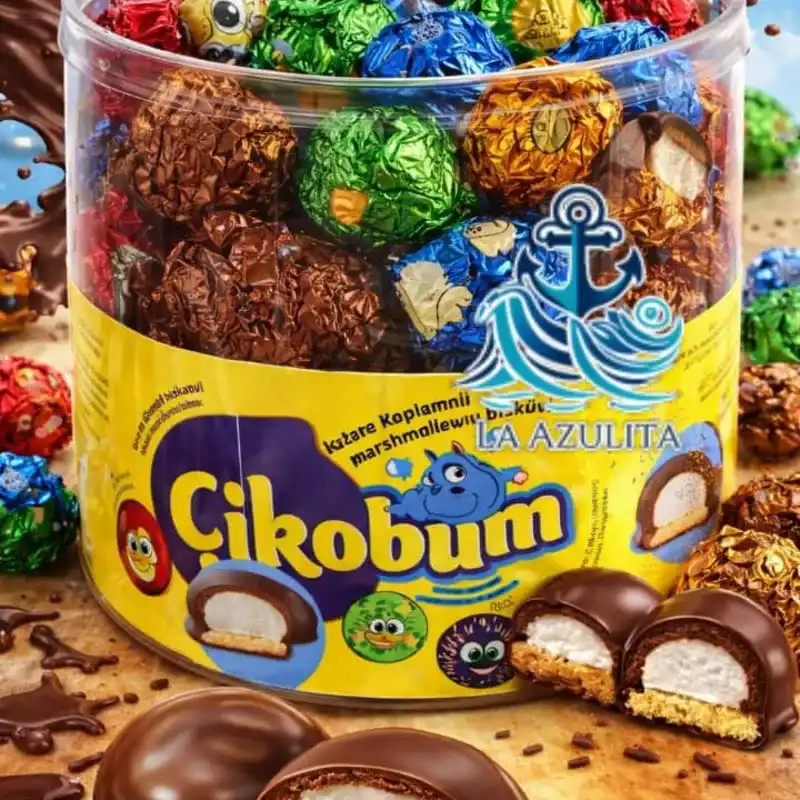 Galleta con malvavisco cubierta de chocolate. Presentación: envase plástico con unidades envueltas individualmente. Peso neto: 700 g. Origen: Turquía.