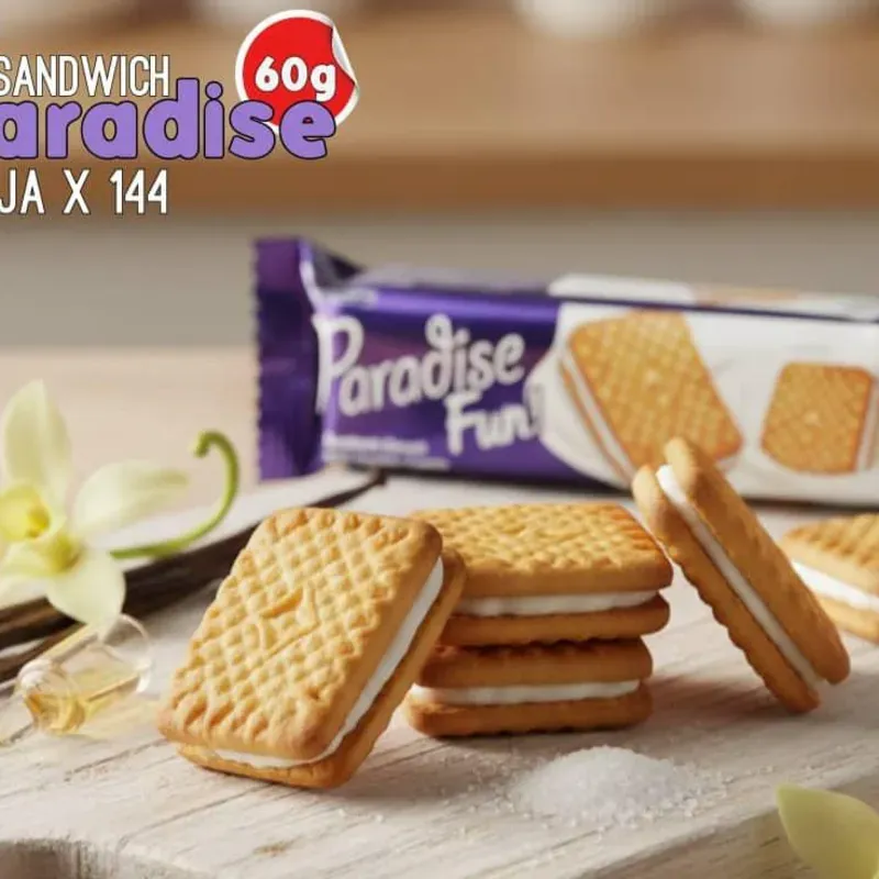 Deliciosas galletas tipo sándwich con suave relleno cremoso y crujiente textura dorada.