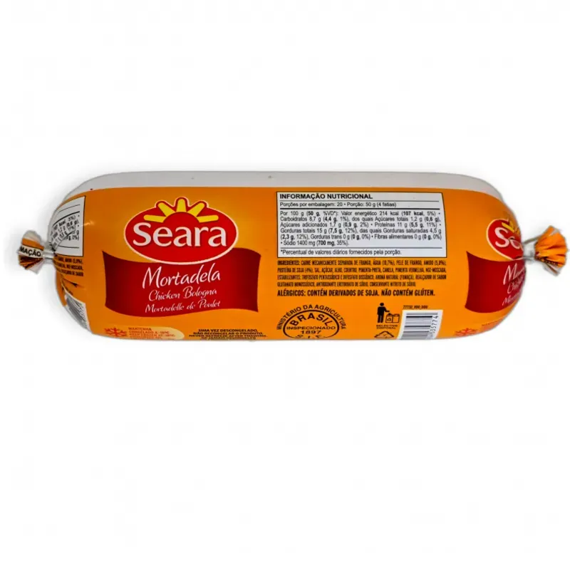 Ingredientes: Carne de pollo y cerdo separadas mecánicamente, agua (10,7%), piel de pollo, almidón (5,8%), proteína de soja (4%), sal, azúcar, ajo, cilantro, pimienta negra, canela, pimiento rojo, nuez moscada, estabilizadores: trifosfato de difosfato disódico, sabor natural (humo), potenciador del sabor glutamato monosódico, antioxidante eritorbato de sodio, conservador nitrito de sodio. Origen: Brasil.