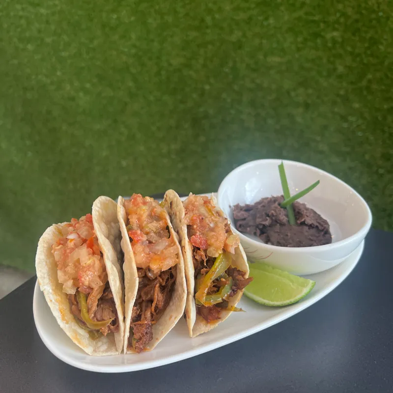 3 unidades de tortilla naturales acompañado de carne desmechada , guacamole y de humus de frijol negro picante