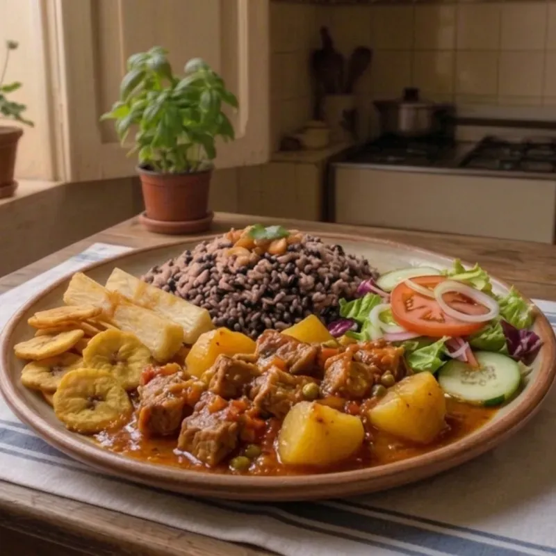 COMPLETA DE FRICASE DE CERDO, ARROZ CONGRI, VIANDA FRITA, ENSALADA MIXTA.