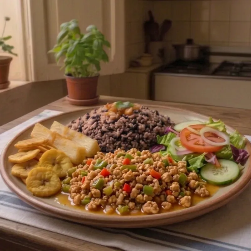PICADILLO DE PAVO A LA CUBANA, ARROZ CONGRI, VIANDA FRITA, ENSALADA MIXTA.