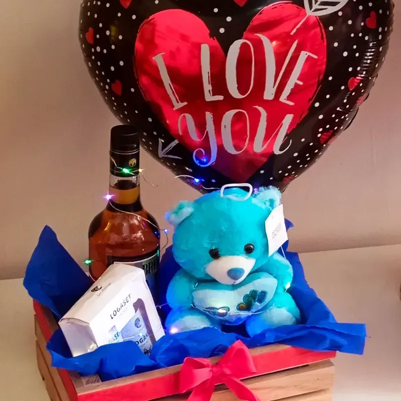 CESTA DECORADA OSO PELUCHE SET DE PERFUME Y CREMA BOTELLA DE WHISKY