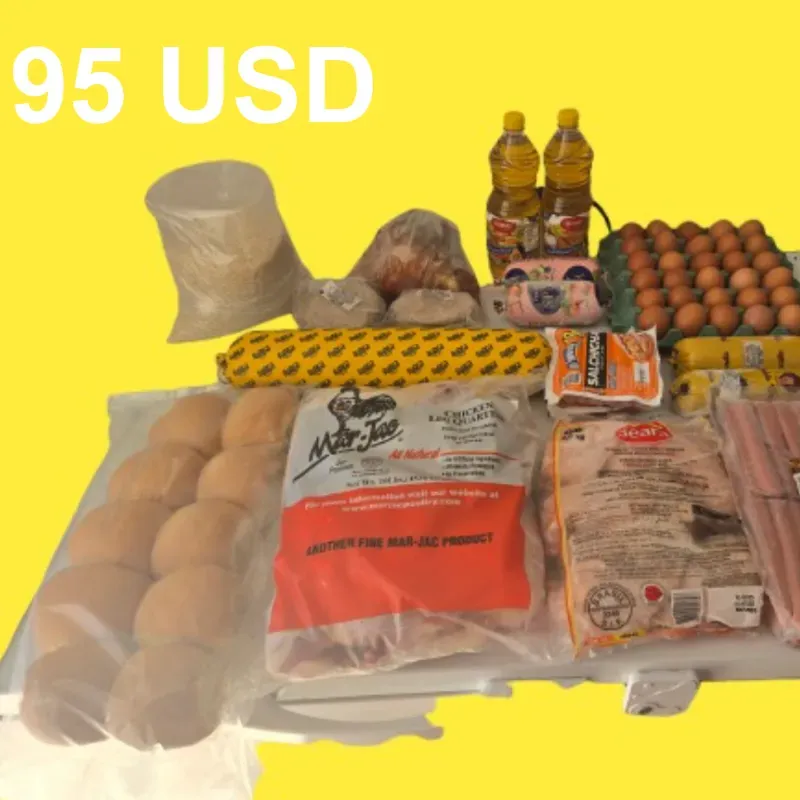 15-Libras de Arroz Importado. 1-File de Huevos. 1-Picadillo Condimentado. 1-Picadillo de Jamón. 1-Paquete de Salchicha de 3kg. Paquete de Pechuga de Pollo 2kg. 1-Paquete de Pollo 10lb Muslo y Contramuslo. 2-Paquetes de Salchicha de 12u 408gramos. 2-Tubos de Spam. 2-Pomos de Aceite 900ml. 2-Paquetes de Hamburguesa. 1-Tubo de Jamón York 5lb. 1-Bolsa de 10 Panes. 3-Libras de Pollo Ahumado