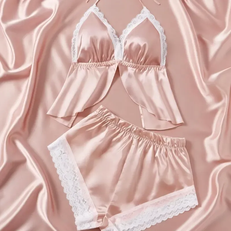Un conjunto en satín color rosa suave que acaricia la piel con un brillo sutil y femenino. Top con escote delicado y detalles en encaje blanco que enmarcan el busto, combinado con short de tiro cómodo que resalta tus curvas con suavidad.