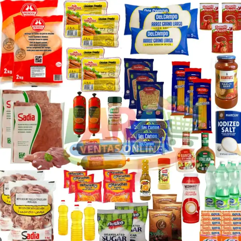 2 Pechuga de pollo (2kg c/u) 2 Hígado de pollo (1kg c/u) 2 Mollejas (1kg c/u) 3 Salchichas de pollo (340g c/u) 2 Jamonada de pollo (500g c/u) 2 Picadillo de pollo (500g c/u) 3 Arroz ( bolsa 5 lb c/u) 3 Pasta de tomate (400g c/u) 3 Coditos (400g c/u) 3 Espaguetis (500g c/u) 3 Frijoles Colorados ( bolsa 1 lb c/u) 3 Aceite ( 900 ml c/u) 3 Azúcar (1 kg c/u) 3 Café Menesiana (120g c/u) 1Coffe Mate Original 1 Salsa de Tomate (680g) 1Sal Yodada (737g) 1Salsa Italiana (473ml) 1Salsa Ranch (473ml) 1Adobo con Pimienta (361.4g) 1 Mojito (295.74ml) 1Sazon Completo (99.2g) 10 Sazón Goya 6 Refresco Gaseado de Limón (1.5 L c/u)
