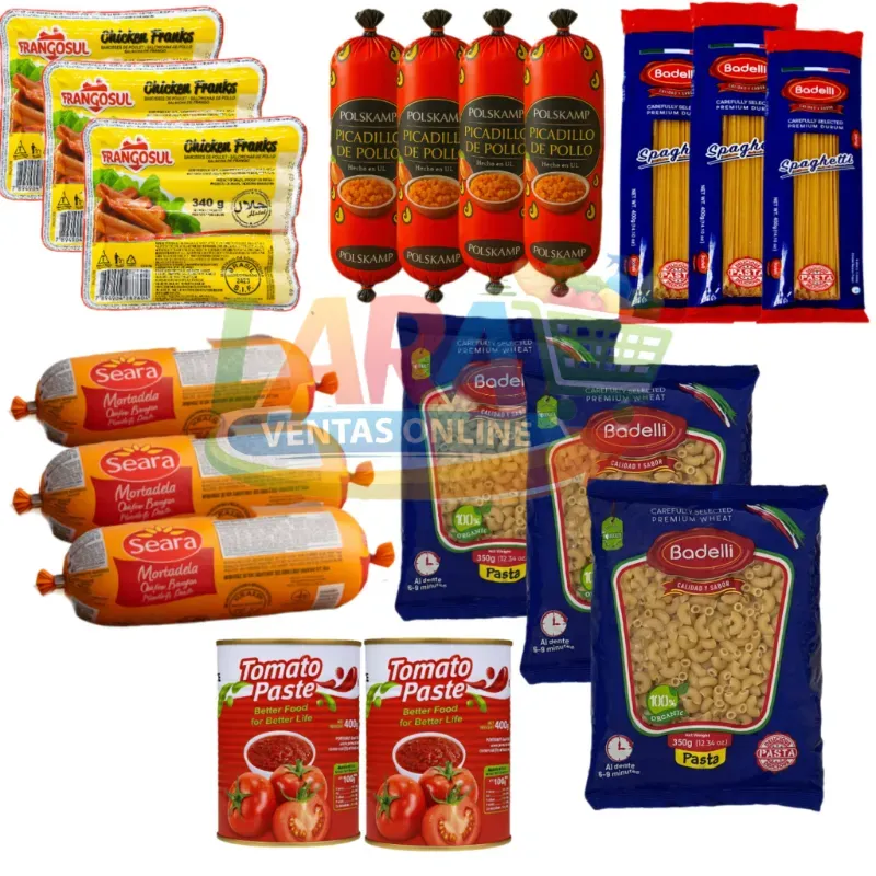 4 Picadillo de pollo (500g c/u) 3 Jamonada de pollo (500g c/u) 3 Salchichas de pollo (340g c/u) 3 Espaguetis ( 500g c/u) 3 Coditos (400g c/u) 2 Pasta de tomate (400g c/u)