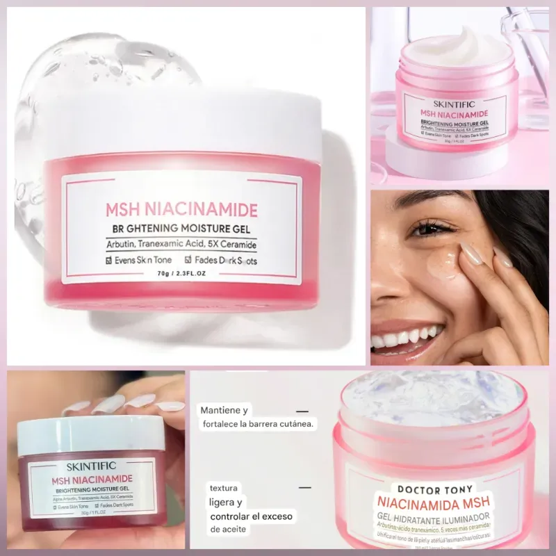 El producto en el recuadro seleccionado es el MSH Niacinamide Brightening Moisture Gel, una crema hidratante de textura ligera tipo gel.