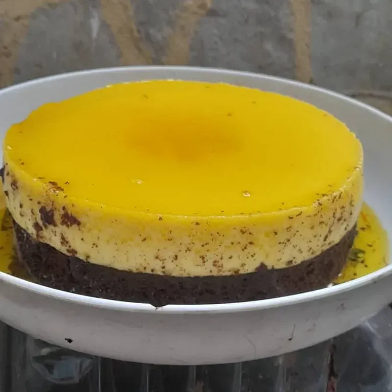 Delicioso postre compuesto por un flan arriba y bizcocho húmedo de chocolate abajo Se realiza domicilio para su comodidad