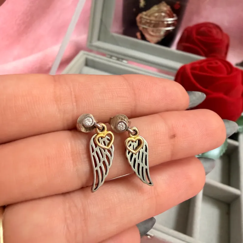 Aretes Pandora alas colgantes con corazón dorado