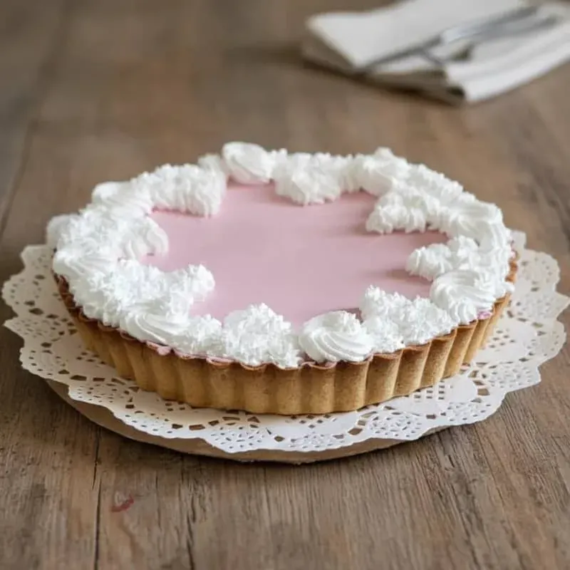 Pay de masa quebrada de 25 cm de diámetro, relleno con crema de frambuesas y decorado con rosetones nata batida.