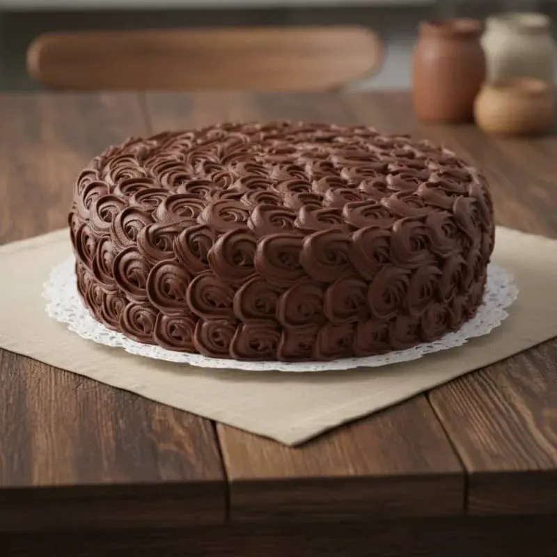 Tarta de 28-30cm de diámetro por 6-8cm de alto. Consta de 2 masas de chocolate y una capa de crema bombón (chocolate fundido con leche condensada) como relleno. Decorada con rosetones de crema de chocolate bombón.
