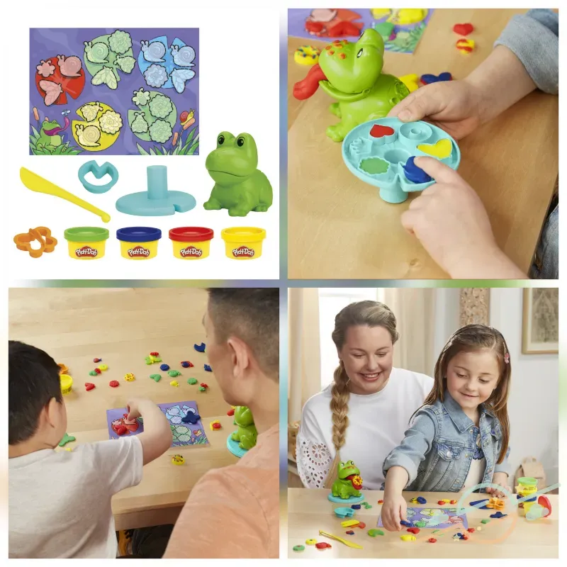Juego de modelar que incluye estructura en forma de rana, con moldes impresos en su cuerpo, 4 botes de plastilina, espátula, 2 moldes grandes y tapate para colocar las creaciones.