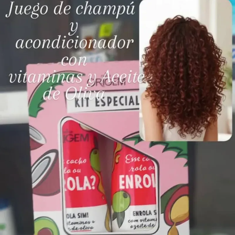 ✅Champú 325ml. ✅Acondicionador 180ml. ✅Hidratación y fuerza. ✅Contiene vitaminas y Aceite de oliva, ayuda a fortalecer el folículo capilar, repara las puntas abiertas y secas, dejándolas sanas y brillante. ✅Ideal para cabellos maltratados y con productos químicos.