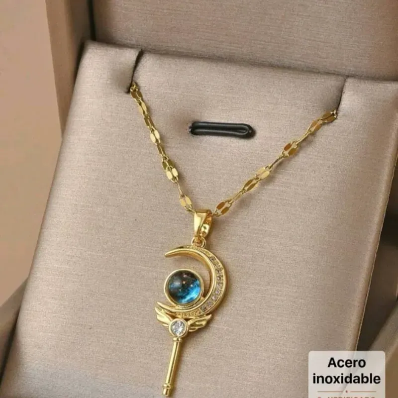 Con forma de un bastón con alas de ángel sosteniendo una luna, con un planeta.