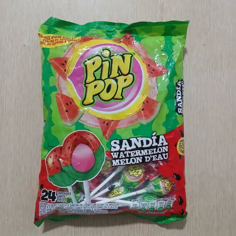 Caramelo duro sabor a sandía relleno con goma de mascar.