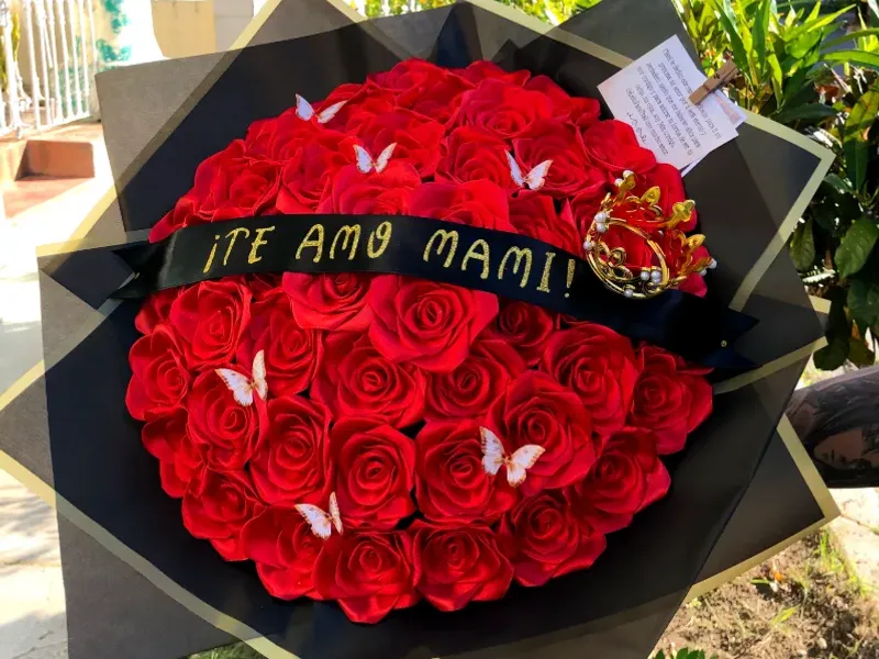 Contiene 50 rosas de satín con el color que desee, envoltura de papel coreano impermeable, bandita, lazos, mariposas, dedicatoria, fotos Polaroids y corona.