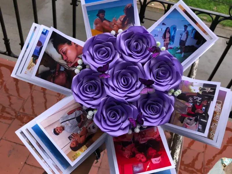Incluye 6 fotos sacadas en papel fotográfico, cartulina blanca o negra, una frase o lazo en la tapa y 7 rosas de satín en la caja central con una dedicatoria en caso de no ponerla en la tapa y mariposas.