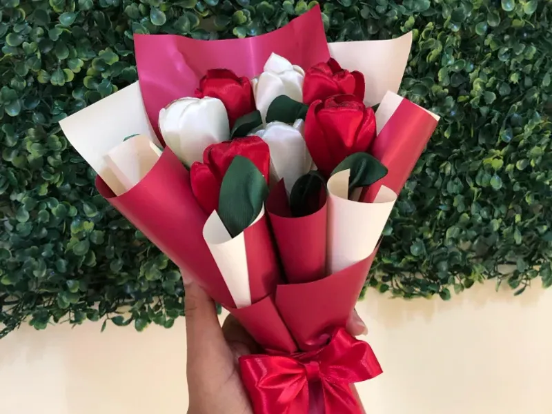 Cuenta con 7 tulipanes eternos hechos de satín con el color a su preferencia, envueltos en papel coreano impermeable con un lazo, trae fotos Polaroids y una tarjeta personalizada.