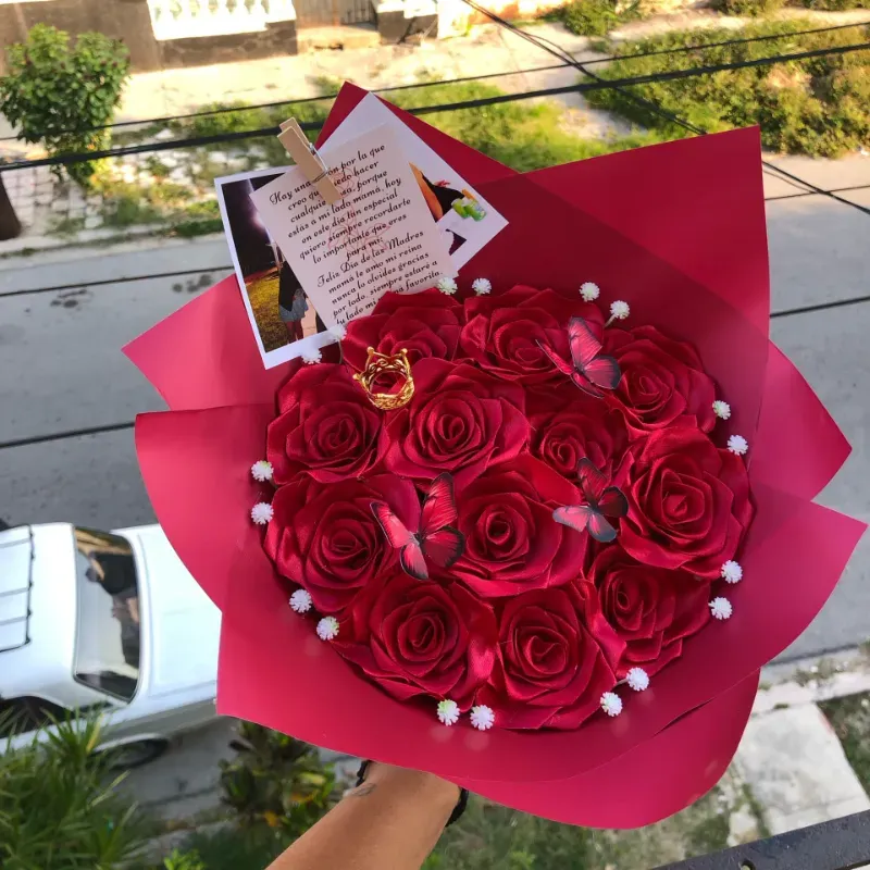 Contiene 12 flores de satín (varios colores) envueltas en papel lustre o papel coreano impermeable, de dos a tres fotos Polaroids o tarjeta.