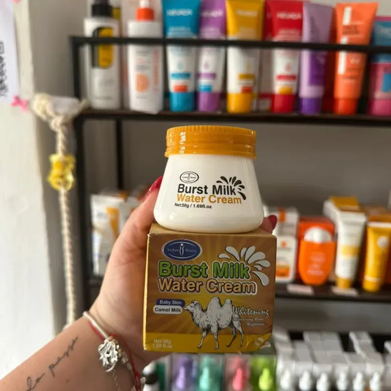 - Efecto de perlas de leche: la crema de leche de camello Brighten envuelve el factor cuidado de la piel para formar una capa protectora, y las pelas de leche estallan y se acarician.
