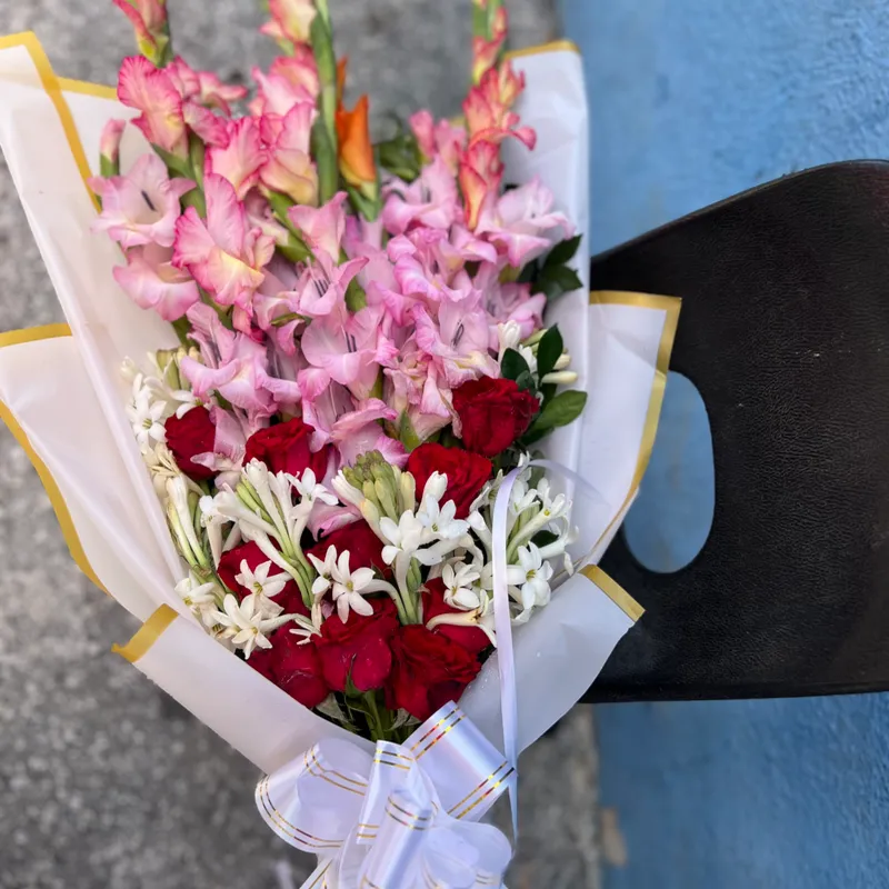 Es grande!! Hecho con gladiolos , Orquídea y pues claro Rosas rojas 🌹 ( príncipe Negro ) y su moño 🎀