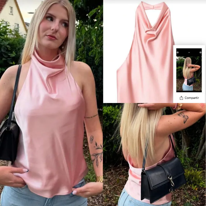 Blusa satinada rosa cuello alto