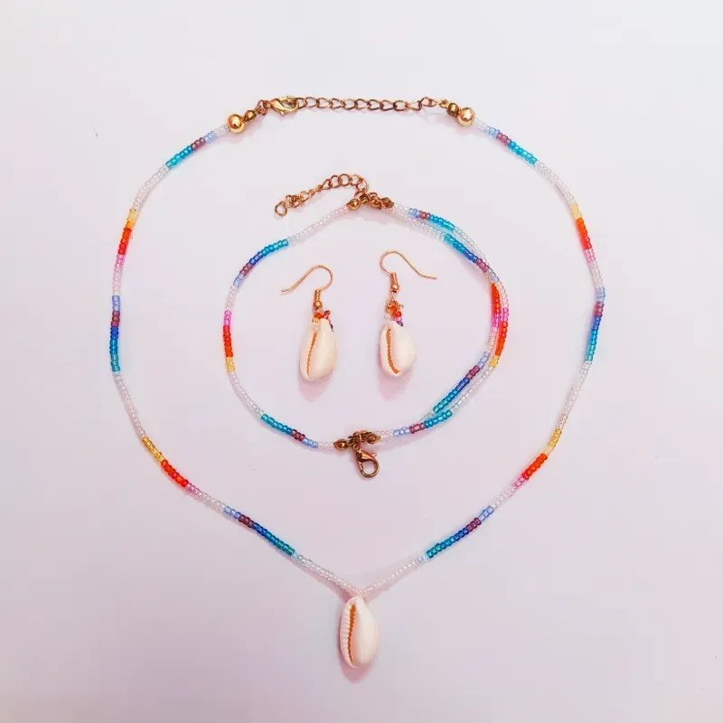 Incluye collar con mostacillas de vidrio y dije caracol, aretes con mostacillas y dijes de caracol y brazalete de tres líneas de mostacillas