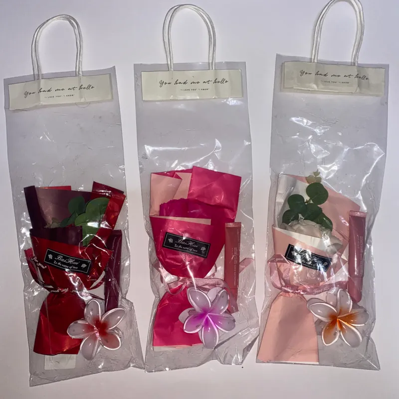 Incluye bolsa, rosa artificial, pellizco hawaiano y labial estilo rodhe