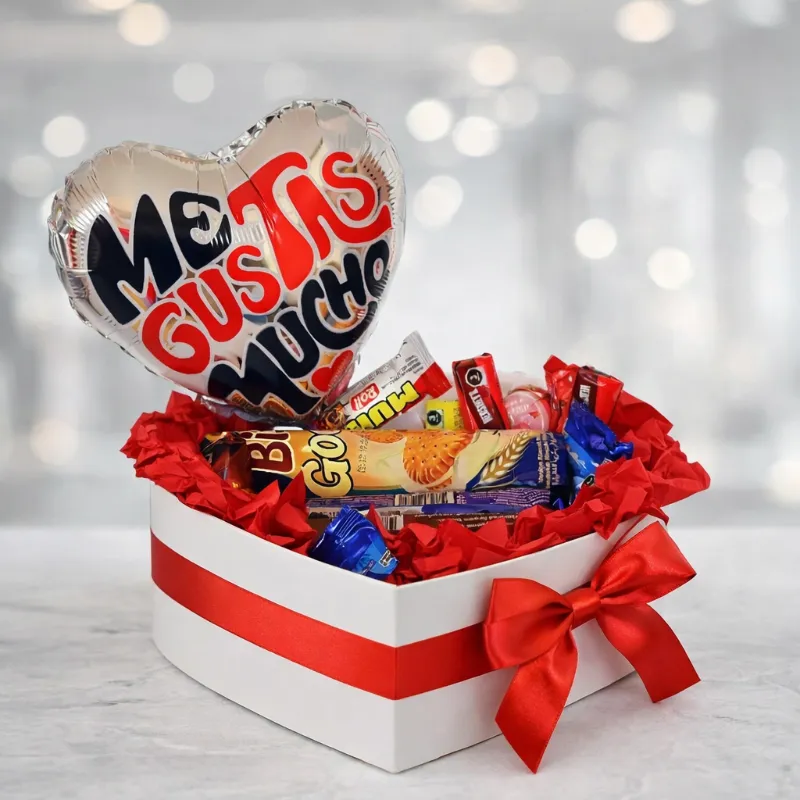 18x20cm 10cm de alto Incluye lazo, relleno de papel crepe, 1 globo y 8 o 10 confituras El color de la cinta puede variar según su gusto