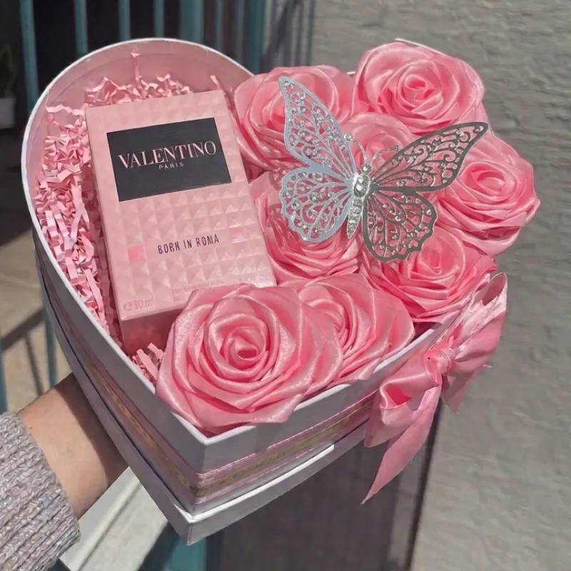 Incluye lazo, 8 rosas eternas, relleno de papel crepe y 1 colonia o perfume.