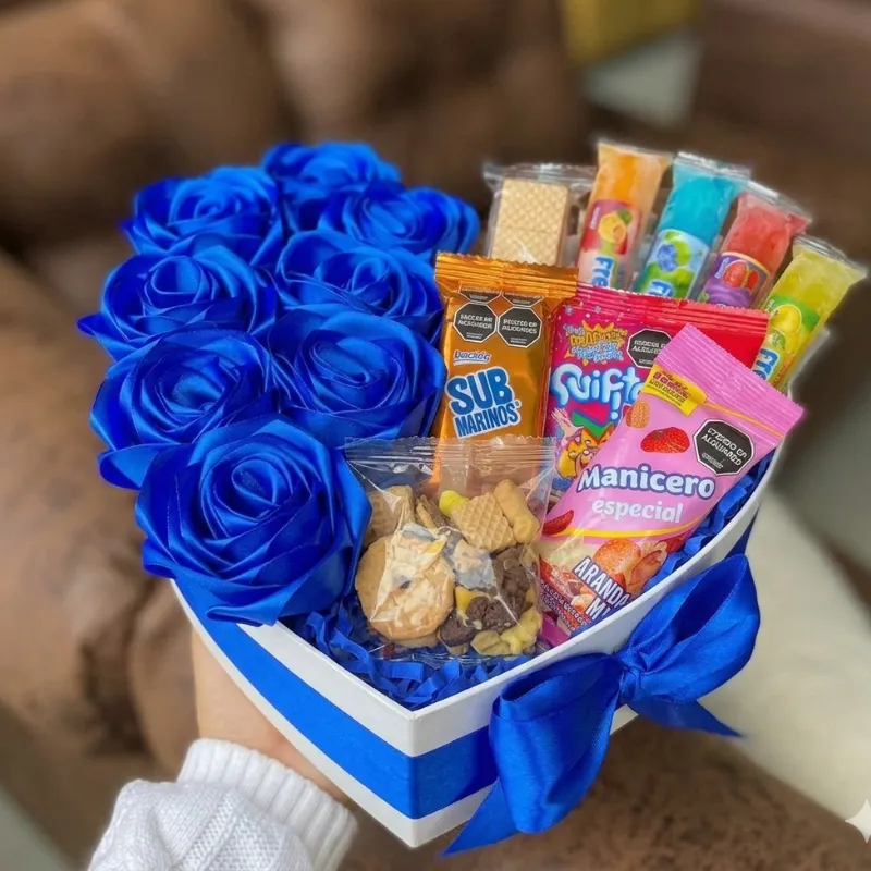 Incluye lazo, 8 rosas eternas, relleno de papel crepe y 8 o 10 confituras