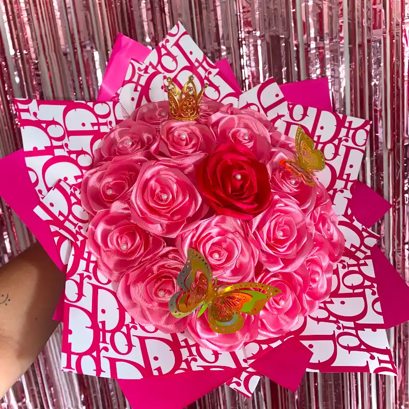 Incluye 20 rosas eternas envueltas en papel coreano, 1 o 2 mariposas 3D, 1 corona y 1 lazo