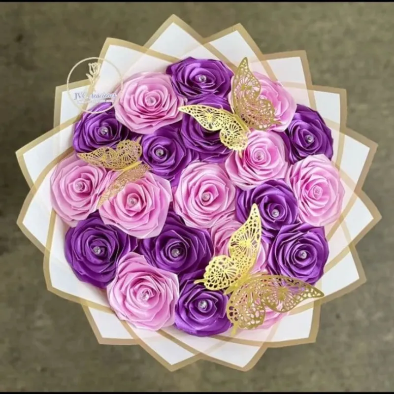 Incluye 25 rosas eternas con perlas envueltas en papel coreano, 3 mariposas 3D y 1 lazo
