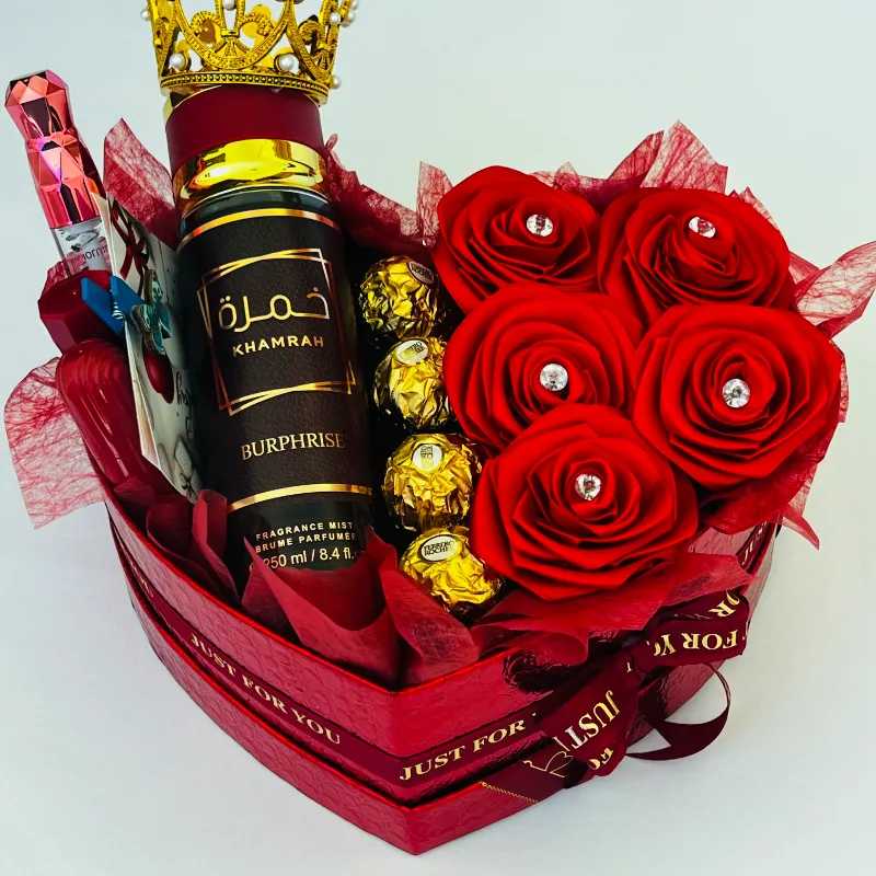 Incluye 5 rosas eternas, colonia, 4 bombones Ferrero Rocher y 3 lip gloss en tonalidades diferentes.
