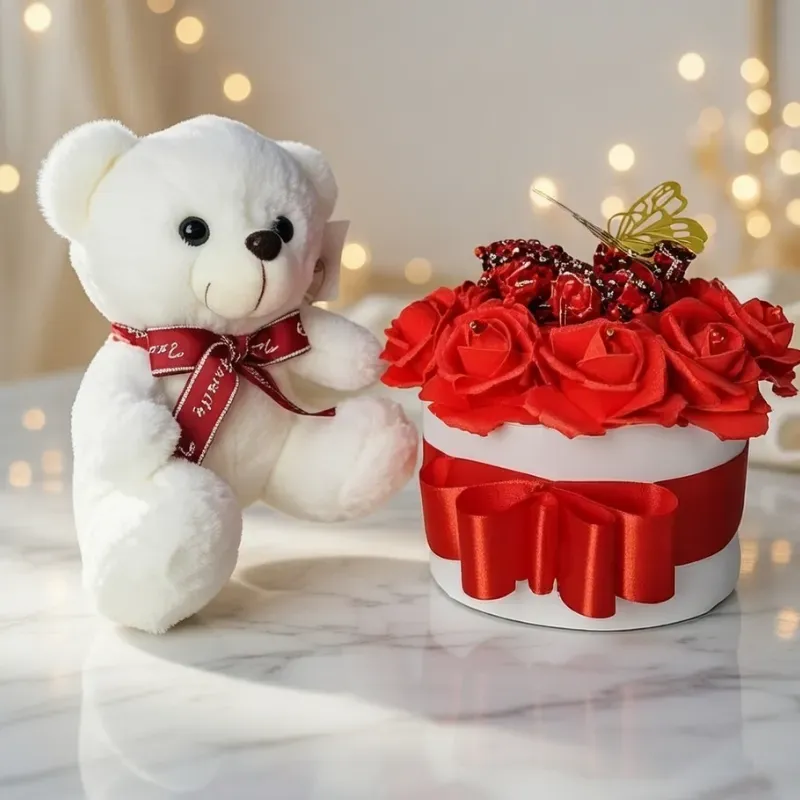 Arreglo floral de 10 rosas artificiales y 10 Bombones