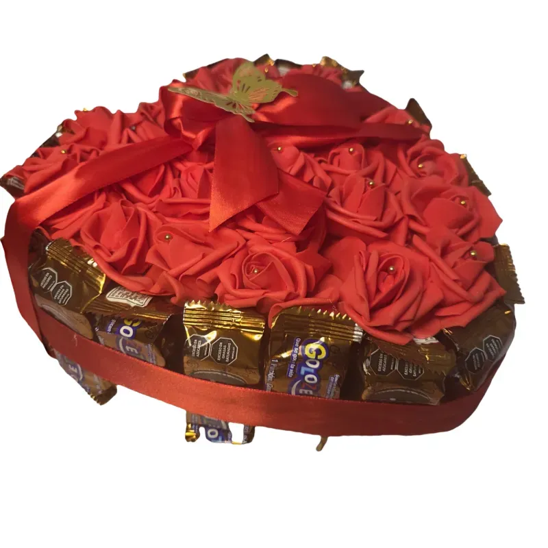 Contenido: 24 paquetes de galletas de chocolate rellenas, 30 rosas artificiales .