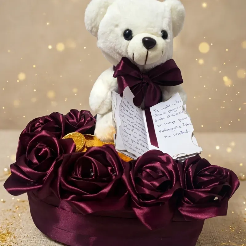 Contenido: Grabadora ( con dedicatoria o canción personalizada) cada vez que se oprime el botón reproduce el sonido, libro ( simulación) con dedicatoria personalizada, peluche, monedas de chocolate, rosas.