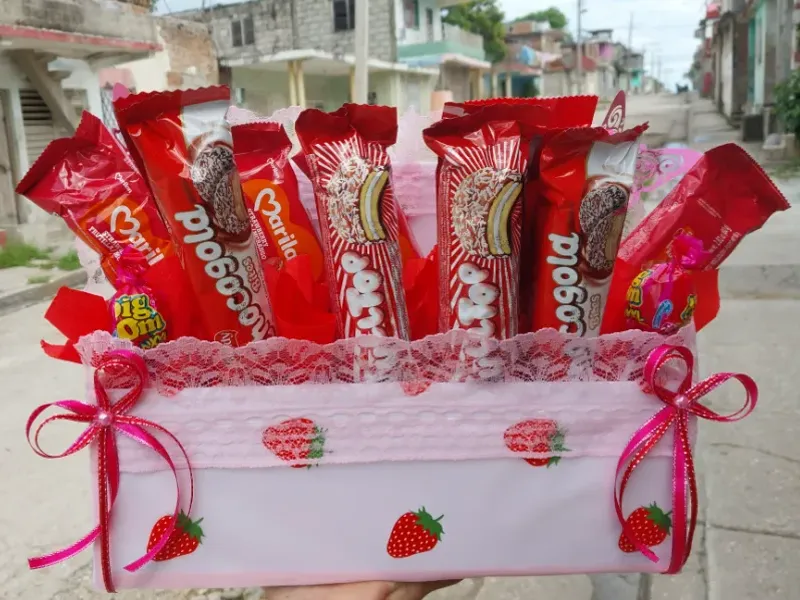 Caja rellena con rosas y confituras