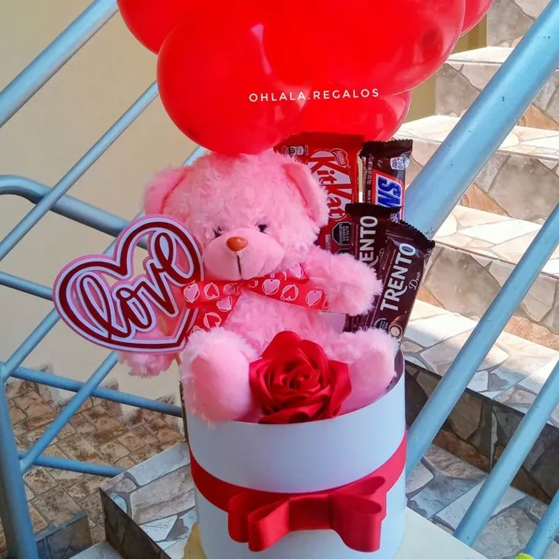 Contiene Peluche tamaño mediano según disponibilidad Confituras según disponibilidad Rosa eterna Decoración Tamaño mediano Imagen referencia de la web