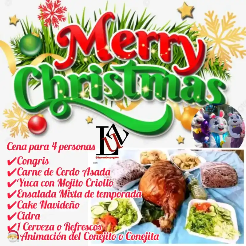 🍽Cena para 4 Personas 🍛 Contiene: ✔️Congris 🍖Carne de Cerdo Asada ✔️Yuca con mojito criollo 🥗Ensalada Mixta de temporada 🎂Cake Navideño 🍾Cidra 🍻Caja de Cerveza, Refrescos o Malta
