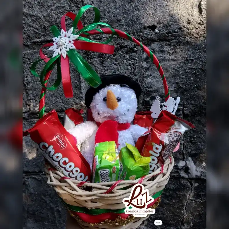 Cesta personalizada tamaño mediano, contiene peluche pequeño y confituras