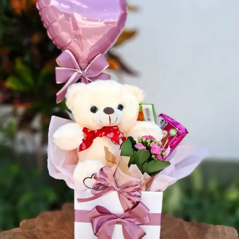 Peluche tamaño mediano según disponibilidad, cesta tamaño pequeño confitura y flores personalizadas,globo