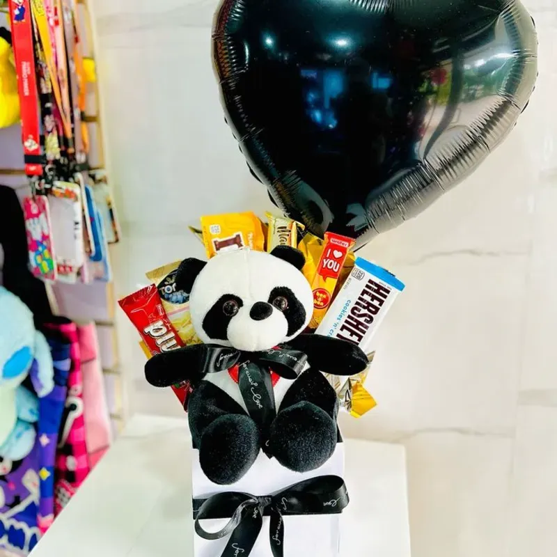 Cesta rellena con peluche panda tamaño mediano,cesta tamaño mediano,confituras y globo
