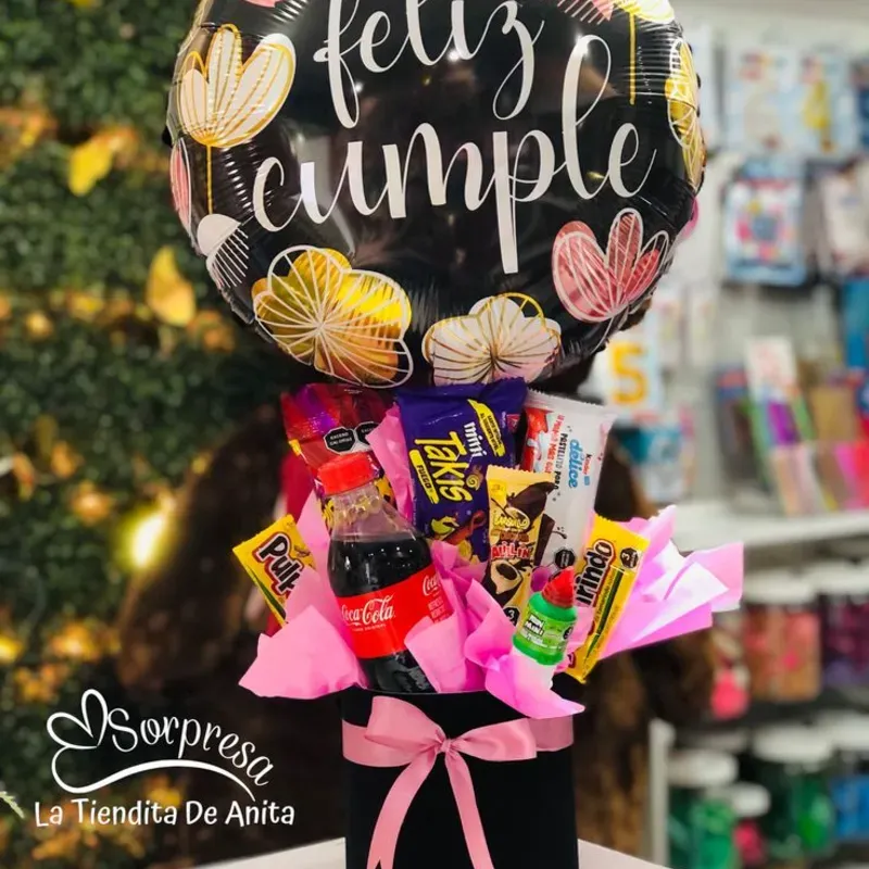 Tamaño mediano Malta de Pomo o lata (según disponibilidad) se puede personalizar con cerveza o Refresco si desea Confituras según disponibilidad Globo temático Imagen referencia de la web